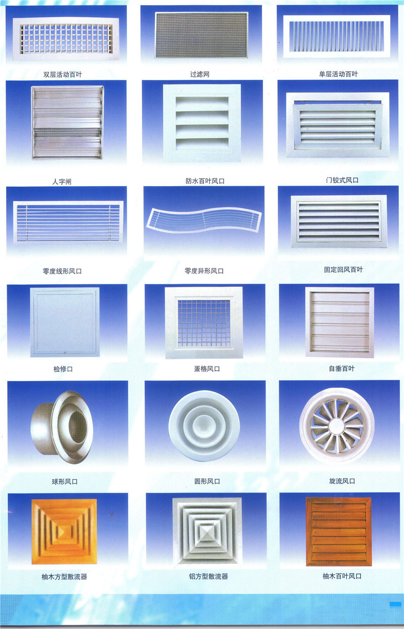 产品通常安装于管道或侧墙上作侧送风口.双层百叶风口有两层可调节角度的活动叶片,短叶片用于调节送风气流的扩散角,也可用于改变气流的方向;而调节长叶片可以使送风气流贴附顶棚或下倾一定的角度(当送暖风时).双层百叶风口的外层叶片或单层百叶风口的叶片可以平行于长边,也可以平行于短边,可以根据客户的要求来选择.风口规格可根据场地应用及客户要求定制,表面处理可喷涂室内聚酯油漆或或外氟碳油漆,颜色任意,亦可做拉丝铝本色或仿木纹色。